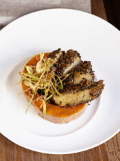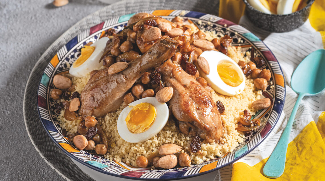 Un piatto unico con cous cous, carne, uova e legumi. Dai sentori orinetali è arricchito con mandorle e uvetta e profuma di cannella