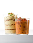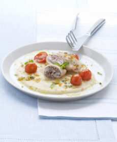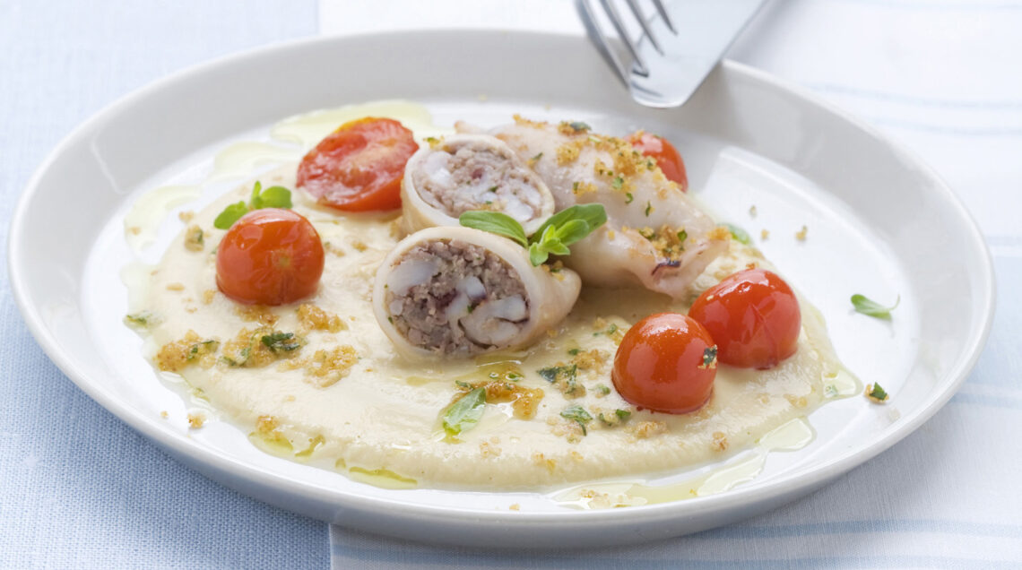 Distribuisci la crema di ceci sui piatti, sistemaci sopra uno o 2 totani ripieni tagliati a metà e completa con il guazzetto di pomodorini. Rifinisci i piatti con un filo d'olio crudo e cospargi con il pangrattato alla maggiorana.