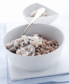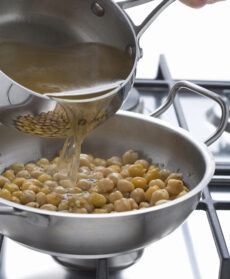 Scola i ceci e sciacquali. Soffriggi lo scalogno in una casseruola con un filo d'olio; unisci i ceci e lasciali insaporire per qualche minuto. Aggiungi il brodo caldo, regola di sale e cuoci per 3-4 minuti dalla ripresa dell'ebollizione. Frulla il composto con un frullatore a immersione, aggiungendo un filo d'olio, fino a ottenere una crema omogenea e tienila in caldo.