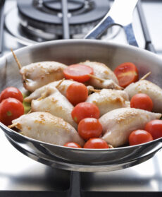 Rosola i totani in una casseruola con 3-4 cucchiai d'olio per 4 minuti e girali spesso con 2 palette, in modo che prendano colore da ogni parte. Aggiungi i pomodori (tagliando a metà quelli più grossi), copri e lascia cuocere tutto da 5' a 10' a seconda della dimensione dei totani. Tosta il restante pangrattato in una padella con un filo d'olio finché sarà leggermente dorato e aromatizzala con la maggiorana rimasta.
