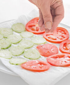 Tritate il prezzemolo con 1 cipolla e l'aglio sbucciati; tagliate a fettine il pomodoro e il cetriolo sbucciato, trasferitele su carta da cucina e spolverizzatele con un pizzico di sale. Tagliate a rondelle la cipolla rimasta.