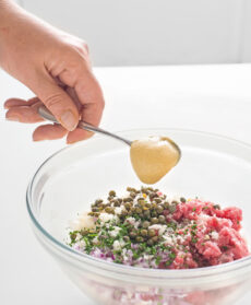 Mescolate in una ciotola la carne di manzo con la mollica di pane sbriciolata, il trito di prezzemolo, aglio e cipolla, i capperini sgocciolati, la senape, qualche goccia di Worcestershire, sale, pepe, il succo del limone e 4 cucchiai di olio.