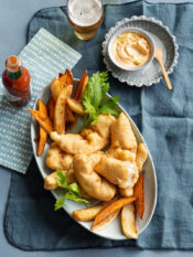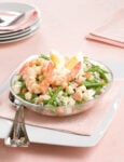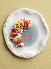1) Sgusciate le code di gambero, staccate i tentacoli dei totani e tagliate le sacche a rondelle. Scaldate una piastra di ghisa, cospargetela con una presa di sale grosso e cuocete i pesci. Trasferiteli in una grossa insalatiera e condite con olio e pepe.