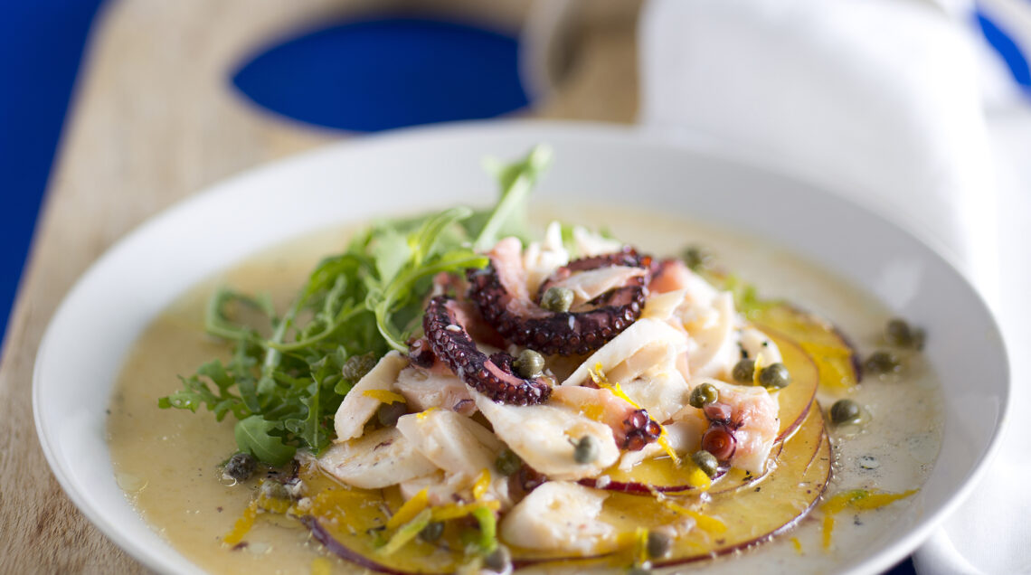 3) Completate e servite l'insalata di polpo estiva. Spremete 1/2 arancia e filtrate il succo, emulsionatelo poi con 4-5 cucchiai d'olio extravergine di oliva, un pizzico di sale, una macinata di pepe e l'acqua di cottura tenuta da parte. Disponetei tutti gli ingredienti nei piatti e condite l'insalata agli agrumi con capperi e pesche con la salsina preparata.