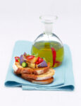 1 Tagliate la carne a striscioline, insaporitela con 1 spicchio d'aglio schiacciato e l'aceto balsamico e lasciatela riposare. Nel frattempo, sbucciate e tagliate le patate a spicchietti sottili. Lavatele più volte, sgocciolatele e asciugatele bene. Scaldate in una padella abbondante olio di arachidi e friggete le patate fino a dorarle. Scolatele su abbondante carta assorbente e salatele.