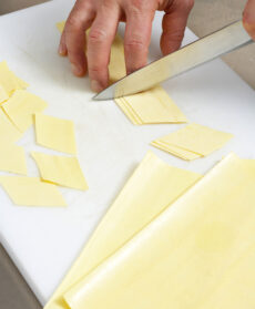 Con un coltello o una rotella tagliapasta tagliate la sfoglia fresca prima a larghe strisce, poi a rombi.