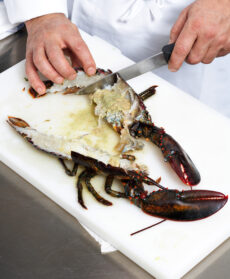 Con un pesante coltello tagliate l'astice, senza sgusciarlo, prima a metà, poi a grossi pezzi. Fateli saltare in una padella con 2 cucchiai di olio finché saranno coloriti, aggiungendo l'aglio schiacciato e peperoncino a piacere.