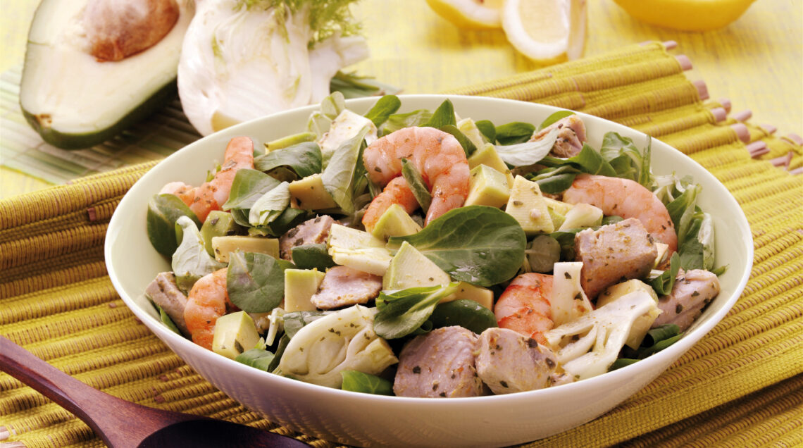 5) Riunisci in una ciotola da portata i gamberi, il tonno, l'avocado, i finocchi, l'insalata e condisci con il dragoncello tritato, sale e pepe. Emulsiona l'olio extravergine con il curry, versa sull'insalata di mare, mescola e servi il Mare e verde.