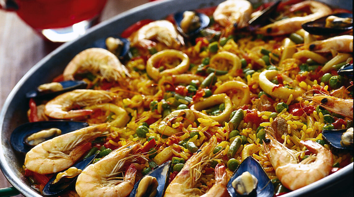 La ricetta qui proposta è una variante facile della famosa paella valenciana, con carne mista di pollo e di maiale, cozze, gamberi e calamari ma anche pomodori, fagiolini e piselli. La preparazione è un po’ lunga, i tanti ingredienti sono cotti prima separatamente poi riuniti nella padellera con il riso. In questo modo si preservano le consistenze degl'ingredienti che la compongono: i chicchi del riso ben sgranati, i frutti di mare non troppo cotti, e la carne succulenta e non stopposa.
