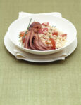 2 Tagliate il pollo a dadi, salatelo, rosolatelo nello stesso condimento dei peperoni per 2-3 minuti e mettete da parte. Ripetete con il maiale (cuocete per 3 minuti), le code di gambero (1 minuto) e i calamari ad anelli (ancora 1 minuto).