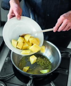 Tagliate le patate a tocchetti. Pulite e rosolate lo scalogno in poco olio, aggiungete le patate, salate, coprite con acqua bollente e portatele a cottura.