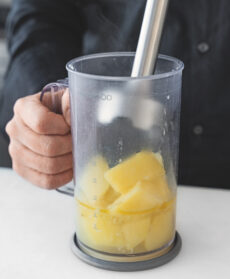 Scolate le patate e frullatele con il frullatore a immersione versando a filo altro olio extravergine, per un totale di 100 ml, fino a ottenere una crema liscia (se necessario aggiungete un po' d'acqua). Tenete da parte.