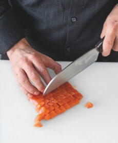 Preparate la tartare, tagliate la ventresca a cubetti regolari e conditeli con un filo d'olio.