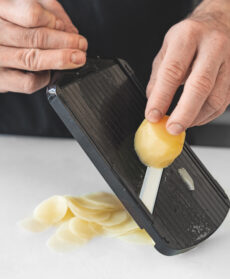 Preparate le chips, affettate sottilmente le patate e lasciatele sotto l'acqua corrente per 15 minuti, poi asciugatele. In una padella scaldate abbondante olio di semi di girasole a 160° e friggetevi le patate (se la temperatura non è troppo alta, le patate perdono tutta l'acqua e rimangono più croccanti)