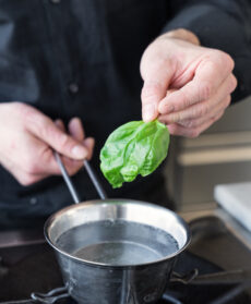 Pulite quindi il basilico, sbollentatelo in acqua bollente, fatelo raffreddare in acqua e ghiaccio e frullatelo alla massima velocità con 200 ml di olio extravergine di oliva. Passatelo con un colino cinese.