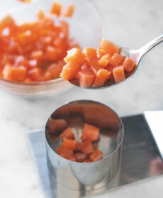 Suddividete la crema di patate nei piatti, disponendo al centro la tartare con un coppapasta.