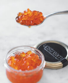 Completate con le uova di salmone, le chips, un filo d'olio al basilico e qualche germoglio; servite.