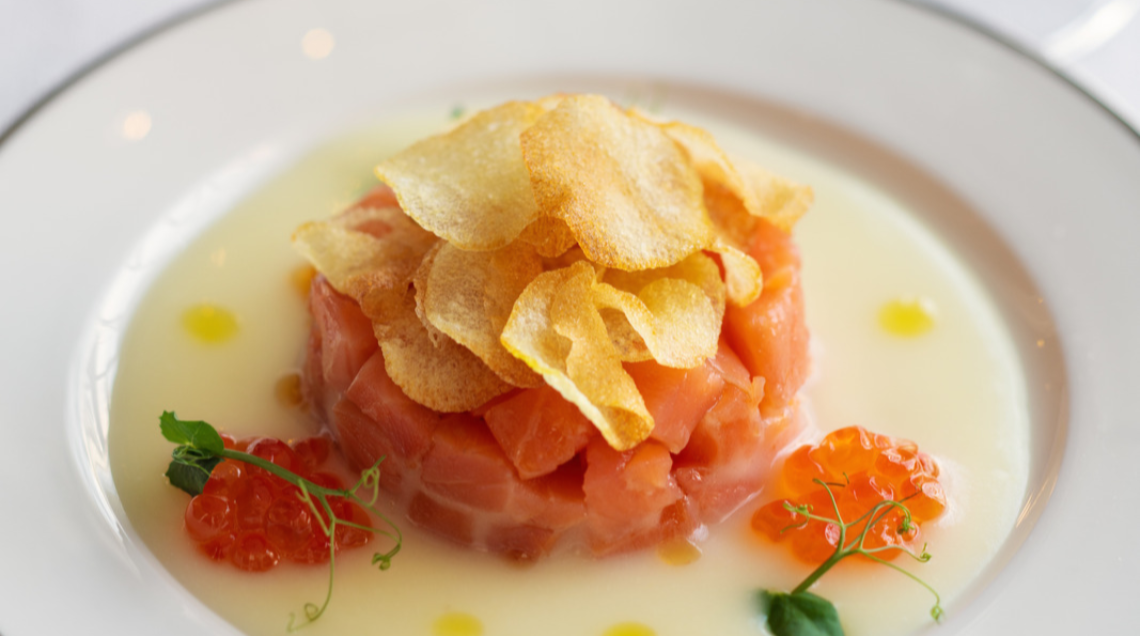 Un elegante secondo di pesce, preparato con una crema di patate allo scalogno e ventresca affumicata. L'olio profumato al basilico inonda il piatto una delicata nota aromatica