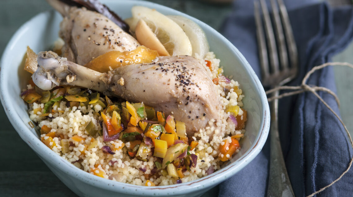 3 Nel frattempo preparate il cuscus, pulite le verdure, tagliatele a piccoli dadi e saltatele in padella con 2 cucchiai d'olio. Fate gonfiare il cuscus come indicato sulla confezione. Quando è pronto unite un cucchiaio d'olio e sgranatelo con una forchetta. Passatelo in padella con le verdure e servite con il pollo.