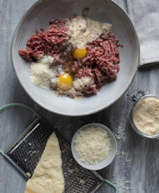 Preparate le polpettine, raccogliete in una ciotola la carne tritata, 2 uova sgusciate, la metà del formaggio grattugiato, 2 cucchiai di pangrattato, sale e pepe; impastate bene gli ingredienti e ricavate tante polpettine delle dimensioni di una nocciola; infarinatele e friggetele in abbondante olio di semi ben caldo. Scolatele e tenetele da parte.