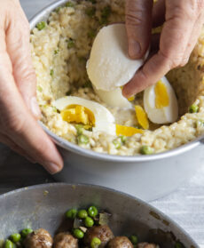 Cuocete il riso, mettete su fuoco moderato una casseruola con circa la metà del sugo preparato e versatevi il riso; portatelo a cottura, tenendolo al dente e bagnandolo ogni tanto con il brodo bollente, come un risotto. Al termine, incorporate 50 g di burro, le 3 uova restanti sbattute e il pecorino rimasto; lasciate intiepidire.