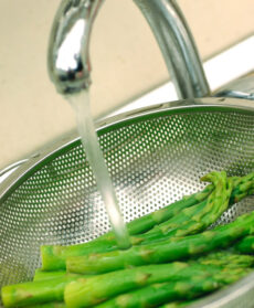Eliminate con un coltello la parte dura del gambo degli asparagi e lavate bene le punte. Intanto disponete il cestello per la cottura al vapore in una larga casseruola. Riempite con una quantità di acqua sufficiente a sfiorare il fondo del cestello e portate a bollore. Disponete gli asparagi nel cestello, cuoceteli con il coperchio per circa 5 minuti, toglieteli dal fuoco quando sono ancora al dente, passateli subito sotto un getto di acqua fredda corrente, per ravvivare il colore, e salateli.
