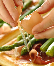 Un piatto unico, da servire per un brunch o per aprire il pranzo di Pasqua. La sfoglia accoglie la sapidità del prosciutto, che contrasta piacevolmente la dolcezza degli asparagi. Il tocco vellutato è dei tuorli