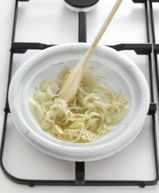 Sbucciate le cipolle, affettatene una sottilmente e tritate l'altra insieme agli spicchi d'aglio. Versate metà dell'olio in una pentola di coccio (possibilmente una tajine), unite la cipolla affettata e fatela rosolare.