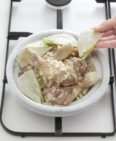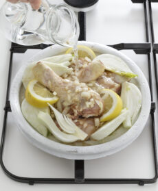 Aggiungete il limone tagliato a fette e 180 ml di acqua e coprite la pentola con il coperchio. Portate a ebollizione, poi abbassate la fiamma e proseguite la cottura per 1 ora circa, girando il pollo una o due volte, fino a quando sarà tenero.