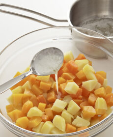 Togliete gli eventuali semi e residui di scorza della zucca, lavatela e tagliatela prima a fette e poi a dadini. Sbucciate le patate, lavatele e riducetele a cubetti delle stesse dimensioni di quelli di zucca.