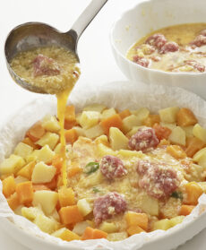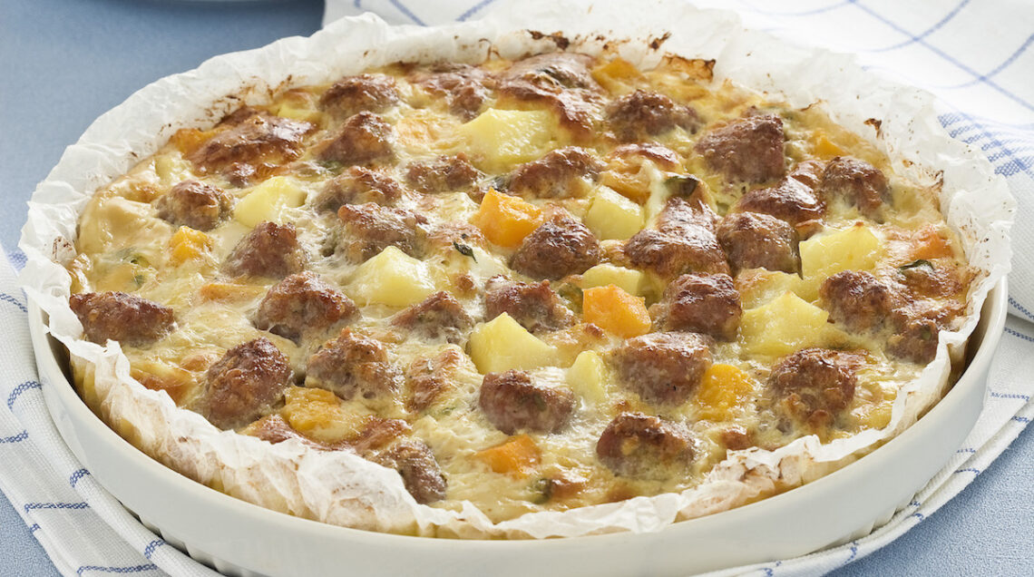 Un rustico piatto misto preparato con una base di base di patate e zucca. I tocchetti di salsiccia, mescolati con panna e formaggio diventano una golosa farcitura