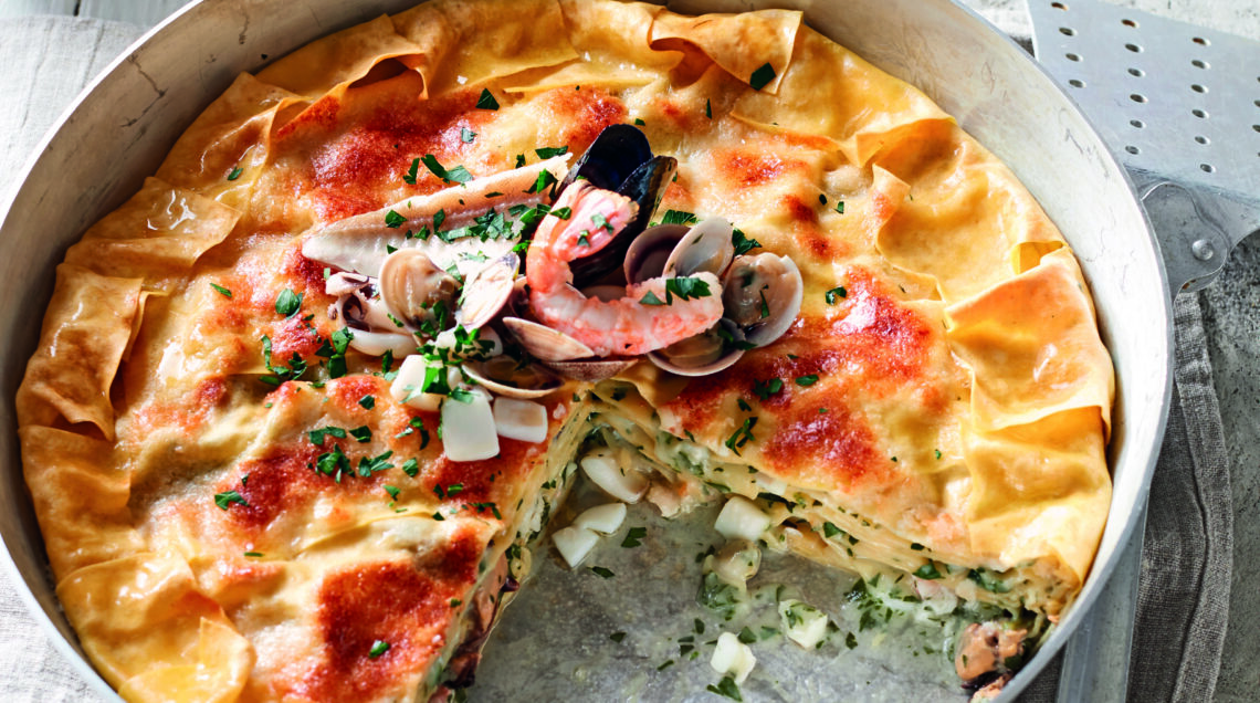 Un piatto unico perfetto per un menù delle feste. Cucinato in bianco è ricco di sapori, tanti quanti sono i tipi di pesce usati nel ripieno. Vino bianco ed erbe aromatiche avvolgono il timballo di profumi, il pecorino aggiunge una piacevole nota pungente
