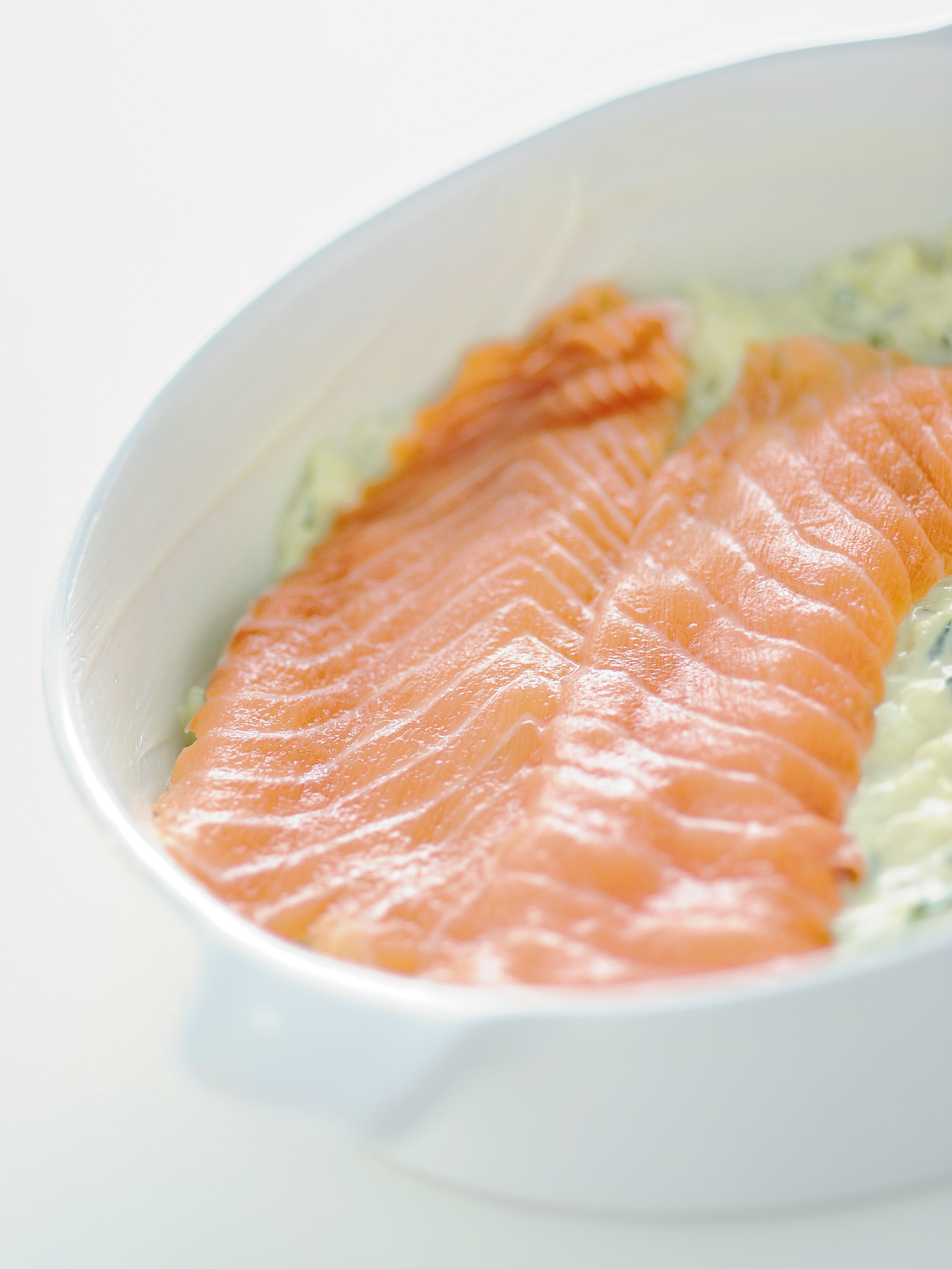 1) Fondi il burro rimasto e lascialo raffreddare. Usalo per spennellare una pirofila. Distribuisci sul fondo del contenitore uno strato sottile di riso e ricoprilo con le fettine di salmone. Aggiungi un pizzico di sale e di pepe, quindi ripeti gli strati: l'ultimo deve essere fatto con il riso.