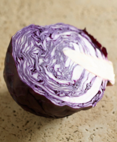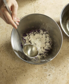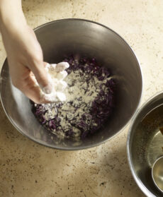 Versate la farina setacciata (potete usare anche quella di grano saraceno) nella ciotola del cavolo rosso.