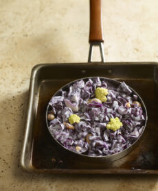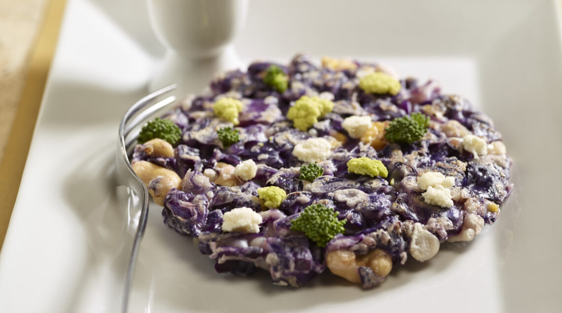 La nostra variante è una proposta vegana, ma la ricetta originale, comunque a base di cavolo-verza, è spesso arricchita con gamberi e pancetta.