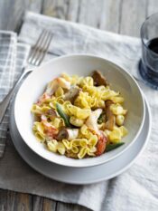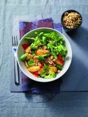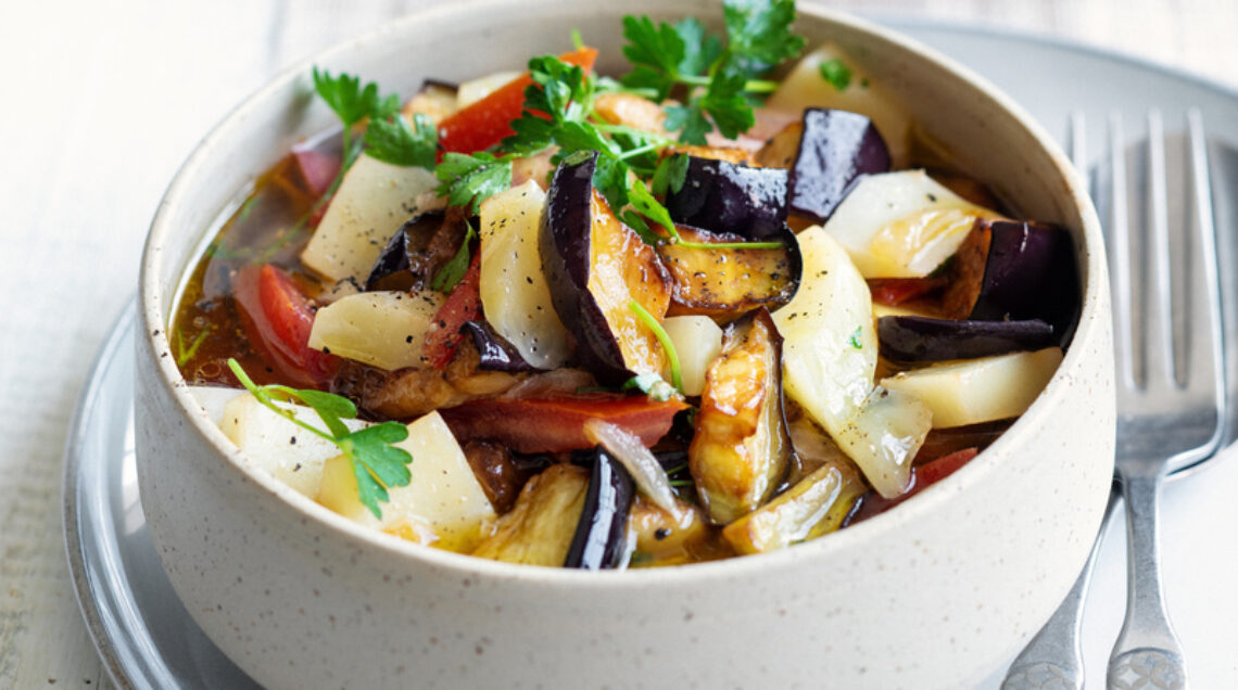3 Tagliate il formaggio a tocchetti e trasferiteli in una terrina con le melanzane; unite la cipolla e i pomodori con il loro sugo e profumate con qualche fogliolina di prezzemolo. Lasciate riposare al fresco per 30 minuti e servite.