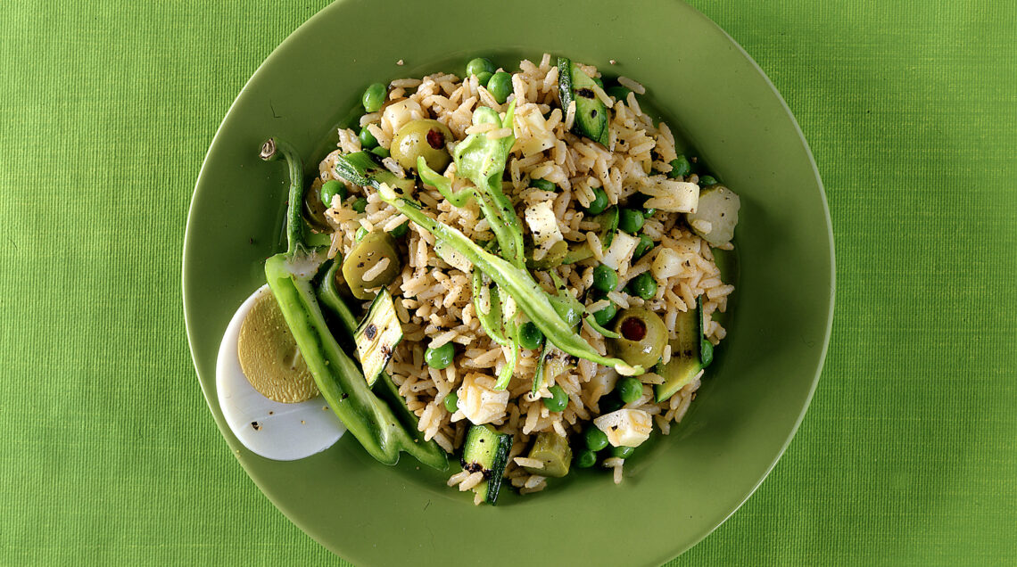 4) Scola il riso, raffreddalo sotto l'acqua fredda e mettilo in un'insalatiera. Unisci tutti gli ingredienti preparati e le olive farcite, condisci con 4-5 cucchiai d'olio e 2 d'aceto, quakche goccia di salsa Worcester, regola di sale e pepe e mescola. Unisci le uova sgusciate e tagliate a spicchi, mescola delicatamente e servi.