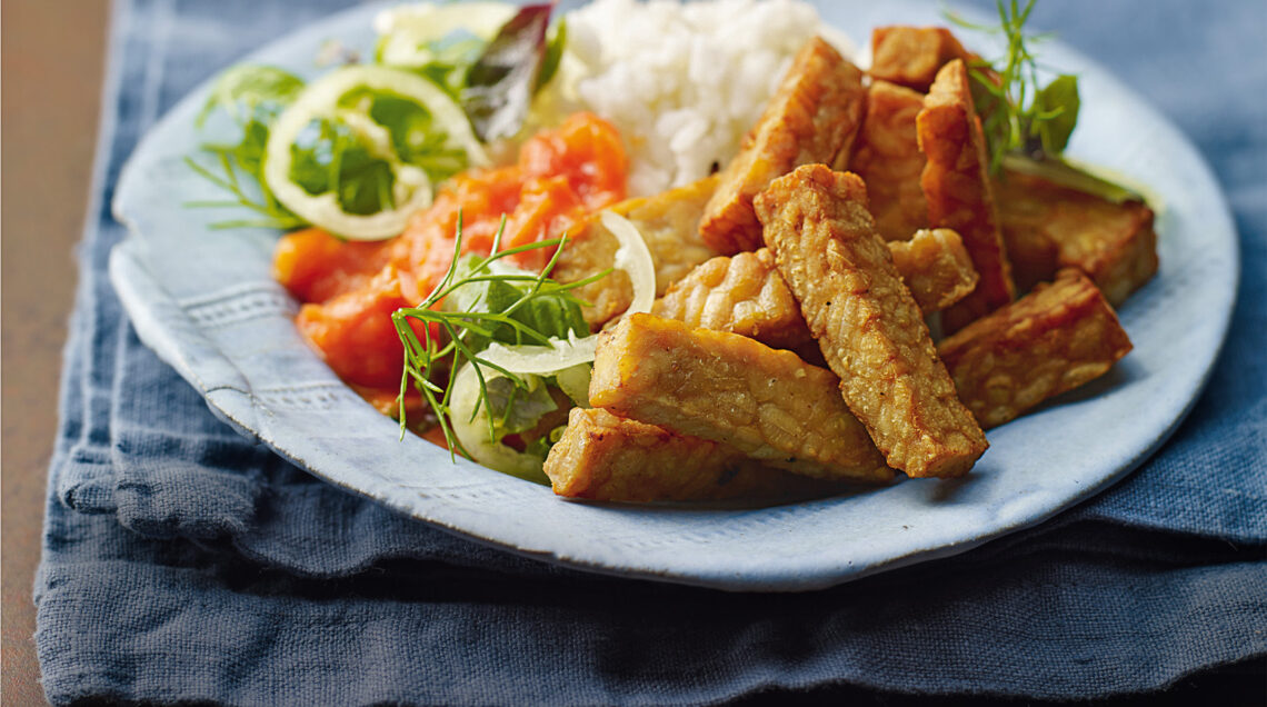 6) Servi il tempeh ben caldo con il riso e il sambal. Puoi accompagnare, se ti piace, con un’insalatina di basilico, finocchio e peperoncino a fettine.