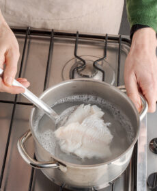 Portate a leggera ebollizione abbondante acqua poco salata e lessatevi 800 g di polpa di pesce (merluzzo, trota) privata di spine, lische e pelle. Sgocciolatela, mettetela in un mixer e azionatelo a intermittenza in modo da tritare la polpa grossolanamente.