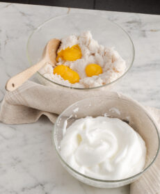 Sgocciolatela e mescolatela con 1 noce di burro e 4 cucchiai di latte. Incorporate prima 4 tuorli, quindi, con movimenti delicati dal basso verso l'alto, 4 albumi montati a neve.