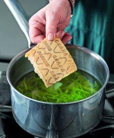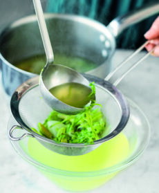 Filtrate il brodo, portatelo a bollore e cuocetevi per pochi minuti gambi e punte degli asparagi.