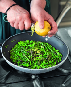 Fate appassire il cipollotto affettato sottilmente con 4 cucchiai di olio, unite gli asparagi scolati e fate insaporire. Fuori dal fuoco, unite 2 cucchiaini di scorza di limone grattugiata, il succo di mezzo limone e qualche fogliolina di timo. Tenete da parte su carta assorbente.