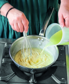Sciogliete il burro in una casseruola, unite la farina, cuocete per 2 minuti, versate 1,5 litri di brodo di asparagi bollente e portate a bollore mescolando continuamente; cuocete ancora per 2 minuti.