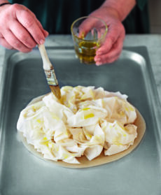 Imburrate una teglia di 20 cm a cerniera. Stendete su fondo e bordi 2 scrippelle, versate un mestolo di vellutata, coprite con uno strato di asparagi e scamorza, poi con un'altra scrippella; proseguite allo stesso modo fino a esaurire gli ingredienti, terminando con una scrippella. Coprite con carta da forno e alluminio e infornate a 190° per 30 minuti. Servite con la pasta fillo arricciata, spennellata d'olio e cotta in forno a 190° per circa 10 minuti.