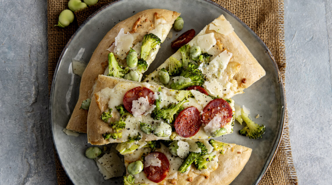 3 Intanto affettate e lavate i broccoletti e cuoceteli per 3 minuti al vapore con le fave, poi condite con olio e sale. Estraete la pizza, distribuite sulla superficie i broccoletti, le fave, qualche fetta di salamino piccante affettato e infornate per 5 minuti. Togliete dal forno, distribuite sulla pizza le scaglie di pecorino, pepate, completate con un giro d'olio crudo e servite.