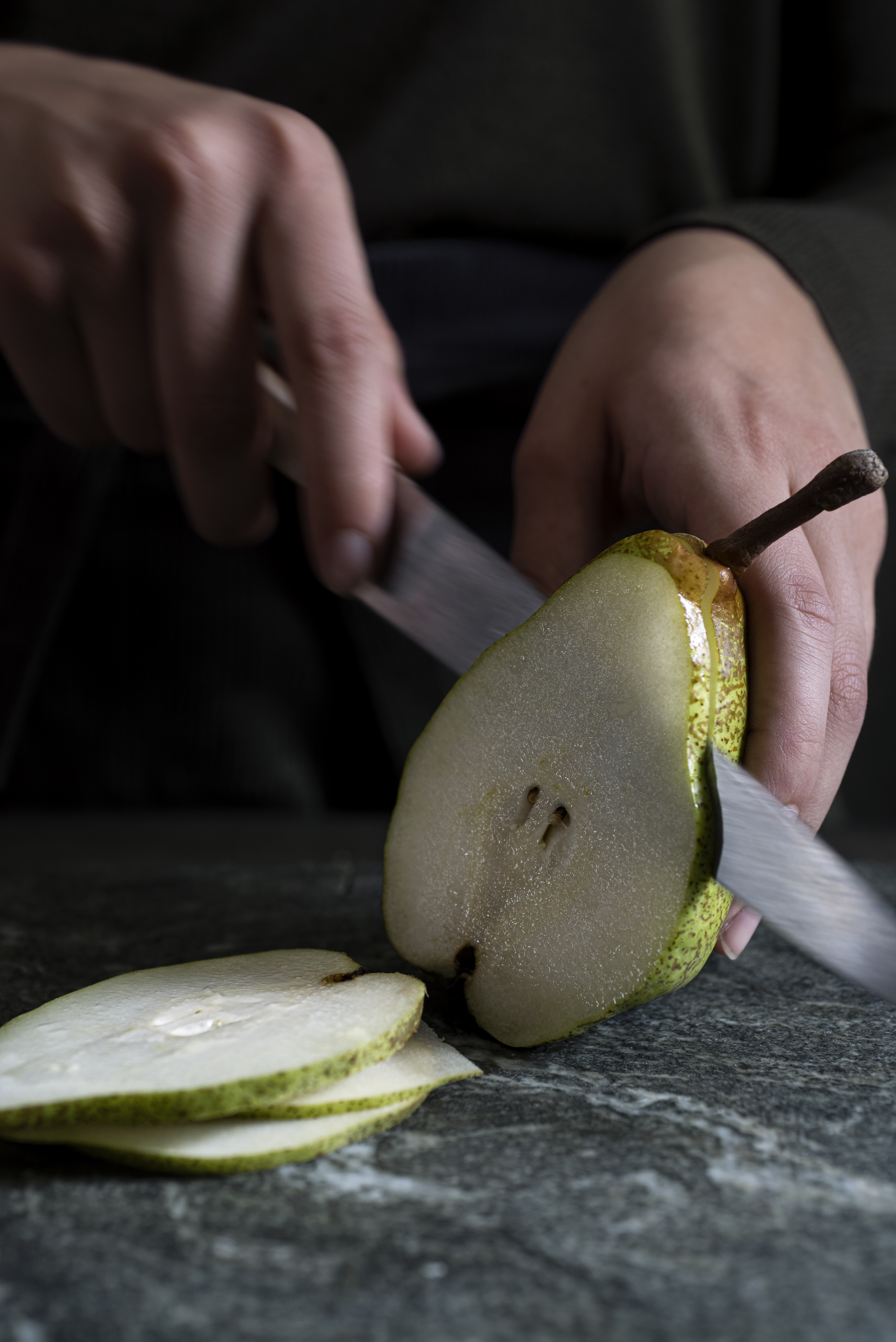 2) Versate la farina in una ciotola, formate un incavo al centro, unite due prese di sale, l'olio e 2 dl di acqua e lavorate gli ingredienti fino a ottenere un impasto liscio ed elastico. Lavoratelo per 5 minuti, dividetelo in 2 parti uguali e stendetele nelle teglie in 2 dischi da circa 28 cm. Fate riposare la pasta per qualche minuto e, intanto, lavate, asciugate e affettate le pere.