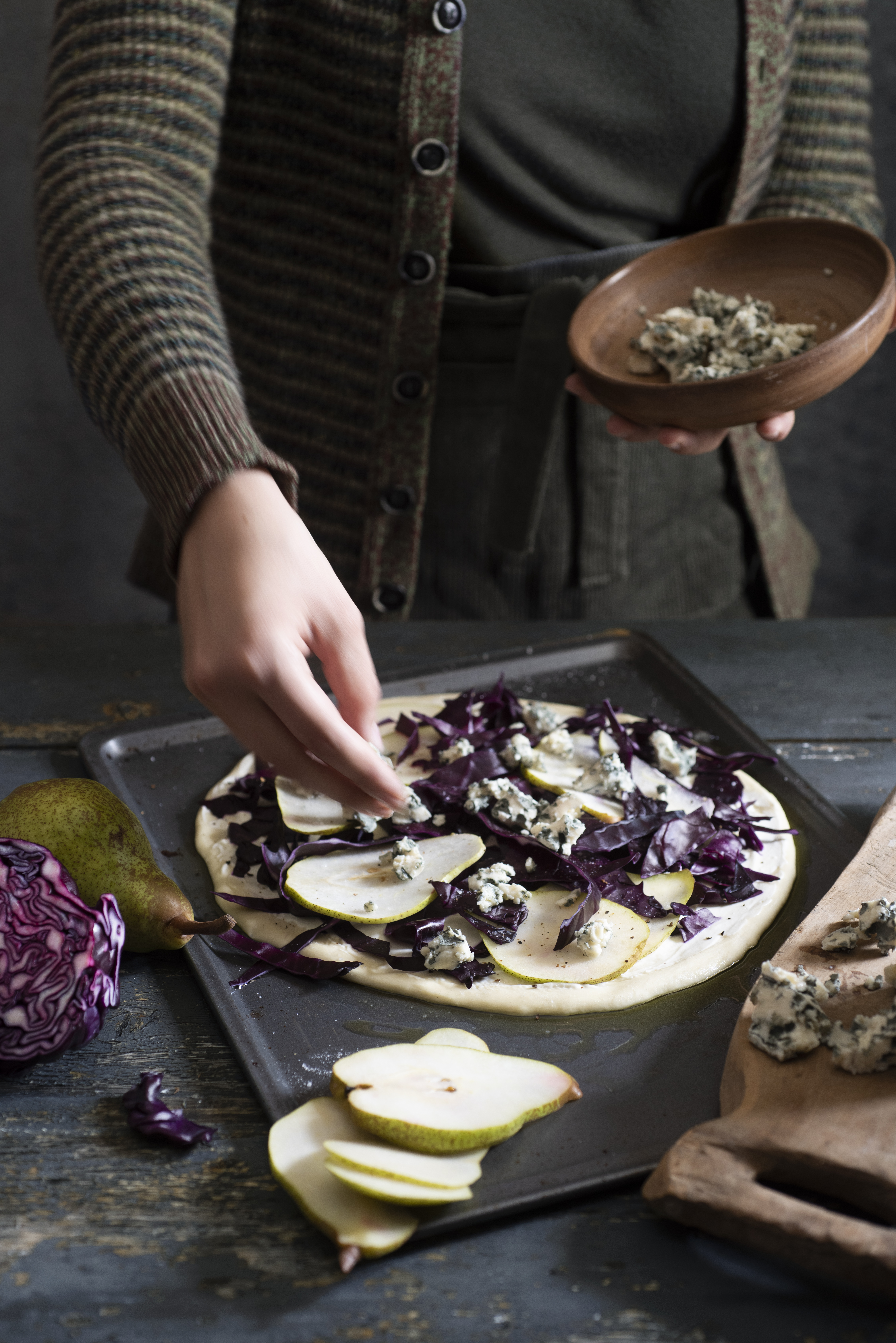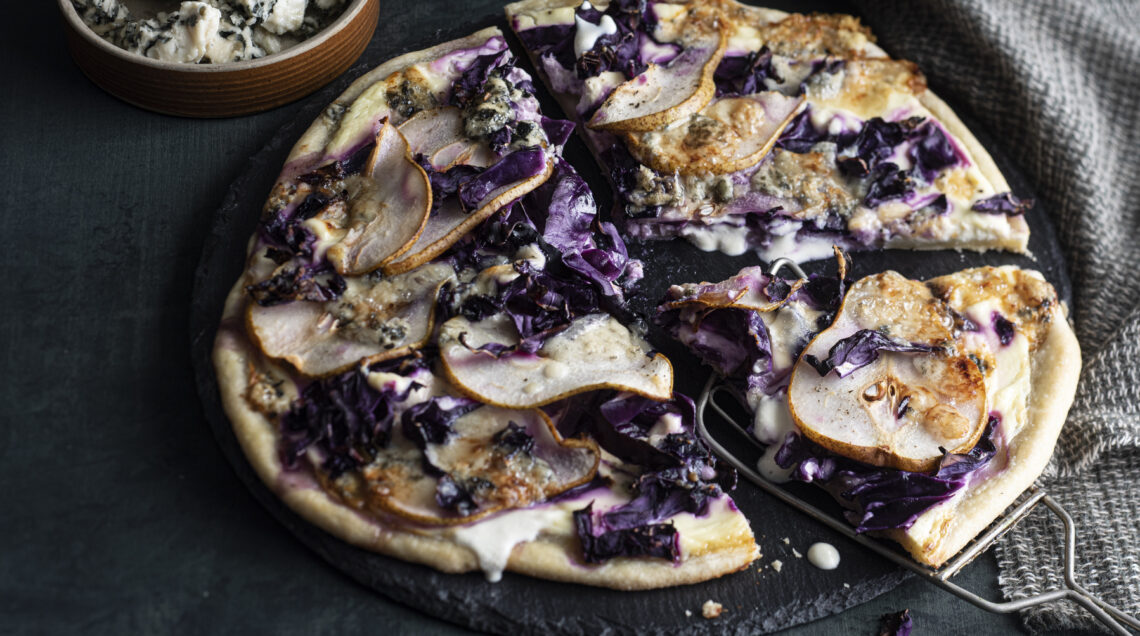 3) Allargate leggermente i due dischi di pasta e spalmateli con uno strato di panna acida. Distribuite sulla superficie il cavolo rosso tagliato a strisce, le fettine di pera e il roquefort sbriciolato grossolanamente. Pepate e infornate le pizze a 200° per circa 15 minuti. Togliete dal forno e servite.