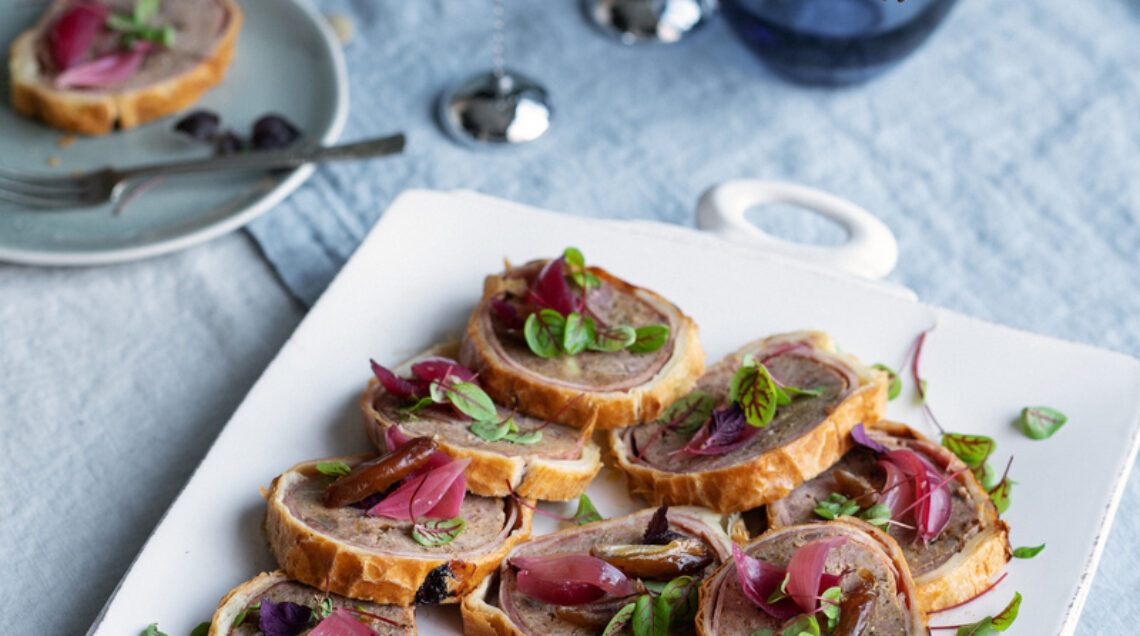 3) Infornate il polpettone a 170° per 20 minuti, poi toglietelo dal forno e lasciatelo intiepidire. Eliminate la carta da forno e avvolgete il polpettone prima con le fette di prosciutto cotto rimaste e poi con la pasta sfoglia, facendo dei piccoli fori qua e là per lasciar fuoriuscire il vapore. Spennellate la superficie con il tuorlo sbattuto con sale e pepe e mettete ancora in forno a 180° per 25 minuti. Lasciate intiepidire il polpettone prima di affettarlo e servirlo guarnendolo con le foglioline, i datteri e le cipolline sott'aceto a listarelle.