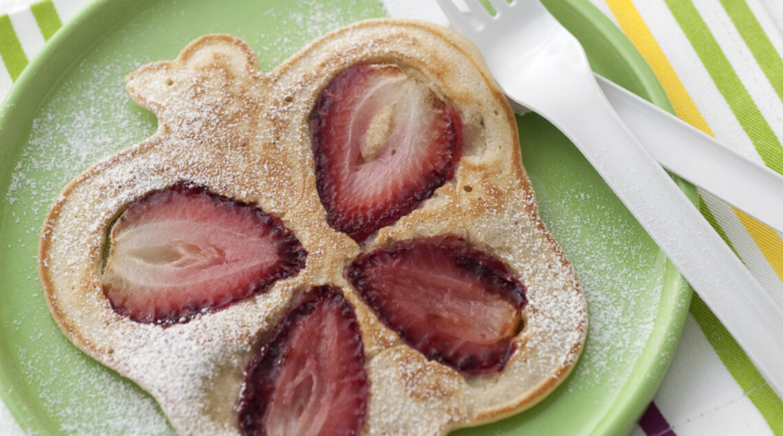 3 )Imburrate una padellina e sistematevi 4 fettine di fragola, formando le ali di una farfalla, poi versate un po' di pastella, facendola scendere da una tasca da pasticcere con bocchetta liscia da 1 cm: disegnate prima il bordo della farfalla, poi riempite le parti vuote. Cuocete 2-3 minuti per lato, poi proseguite nello stesso modo per preparare gli altri pancake. Servite i pancake spolverizzati a piacere di zucchero a velo.