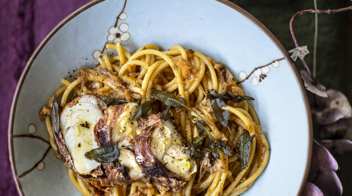 3  Insaporite le cipolle con la colatura di alici. Lessate i bucatini in acqua bollente salata, scolateli e conditeli con le cipolle e distribuiteli nei piatti. Affettate il pesce, disponetelo sulla pasta e pepate. Completate con le restanti foglie di salvia fritte con 2-3 cucchiai di olio.